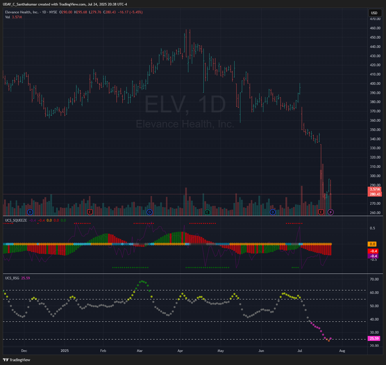 Elevance Health ELV 0.00%↑ has pulled back sharply in reaction to its latest earnings — down ~11–12% intraday — landing near 45–50% below its 52-week highs. That makes this a classic UCS#3: Deviation from Mean scenario: the stock has dropped far beyond its historical average range.
