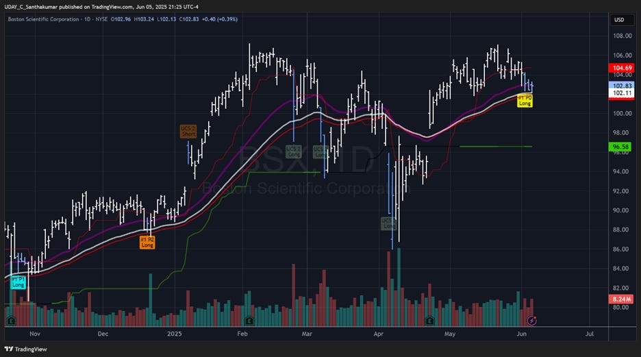 BSX has pulled back to familiar support — assuming it holds and price breaks the double top resistance capping the upside, for a trend continuation. This kind of setup fits the UCS#1 framework: a healthy pullback within trend, potentially ready to break out or reject sharply from resistance.